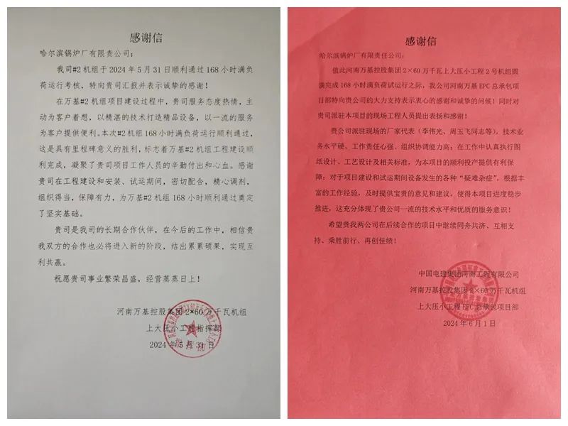 在鍋爐設(shè)備的安裝階段,哈電鍋爐選派業(yè)務(wù)骨干進駐現(xiàn)場服務(wù),及時開展了技術(shù)交底、過程指導(dǎo)、質(zhì)量監(jiān)督等工作。工程代表憑借勤懇的工作態(tài)度、過硬的專業(yè)素質(zhì)和精湛的技術(shù)水平,秉持用戶至上的服務(wù)理念,為現(xiàn)場安裝工作的順利開展保駕護航,獲得了用戶的高度認可。用戶及項目總包方分別發(fā)來感謝信,對哈電鍋爐給予的服務(wù)表示感謝,對哈電鍋爐展現(xiàn)出的契約精神表示贊許,并提出了深化合作的意向!